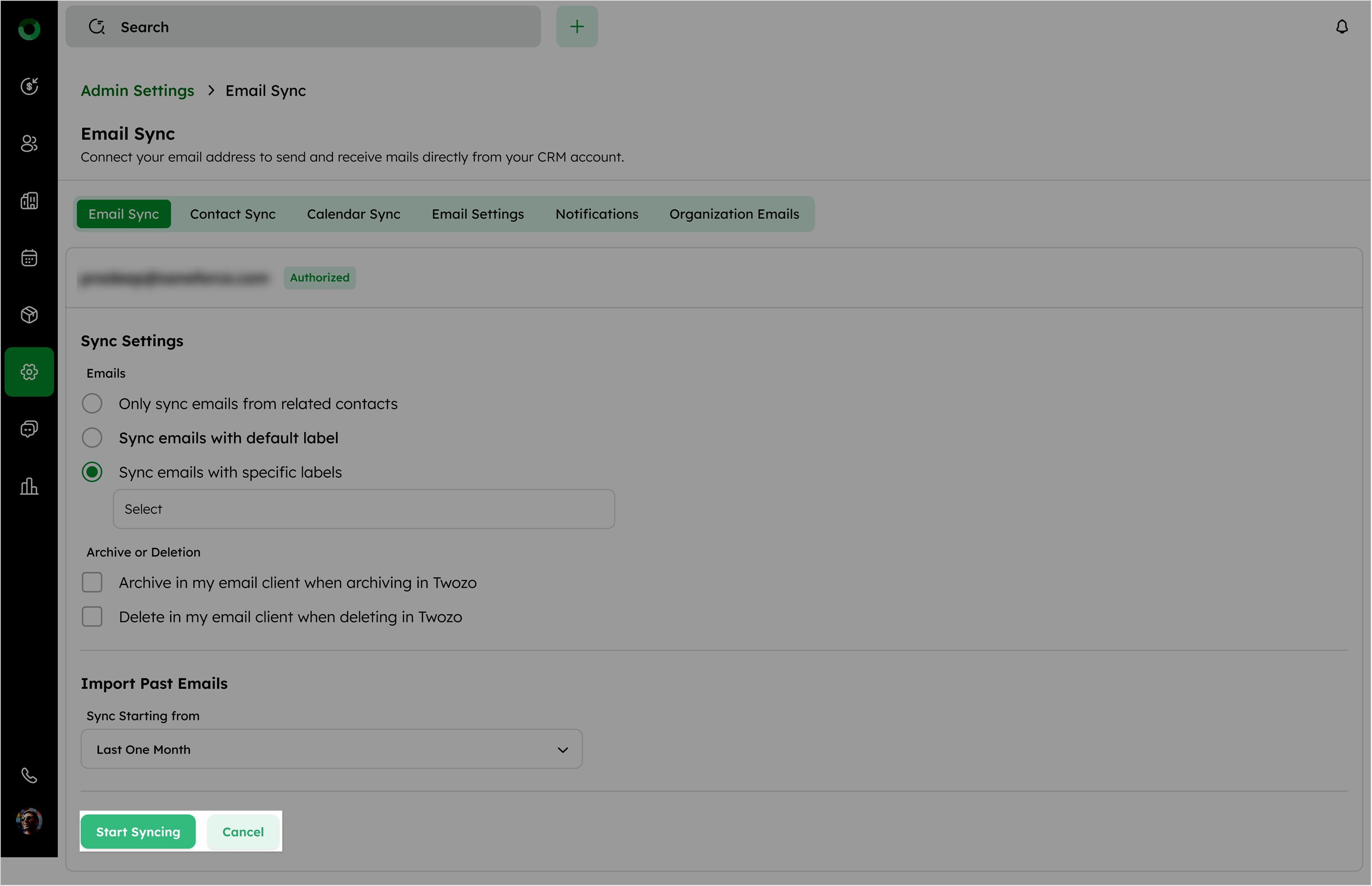 Configure your sync preferences and click Start Syncing to begin syncing emails.