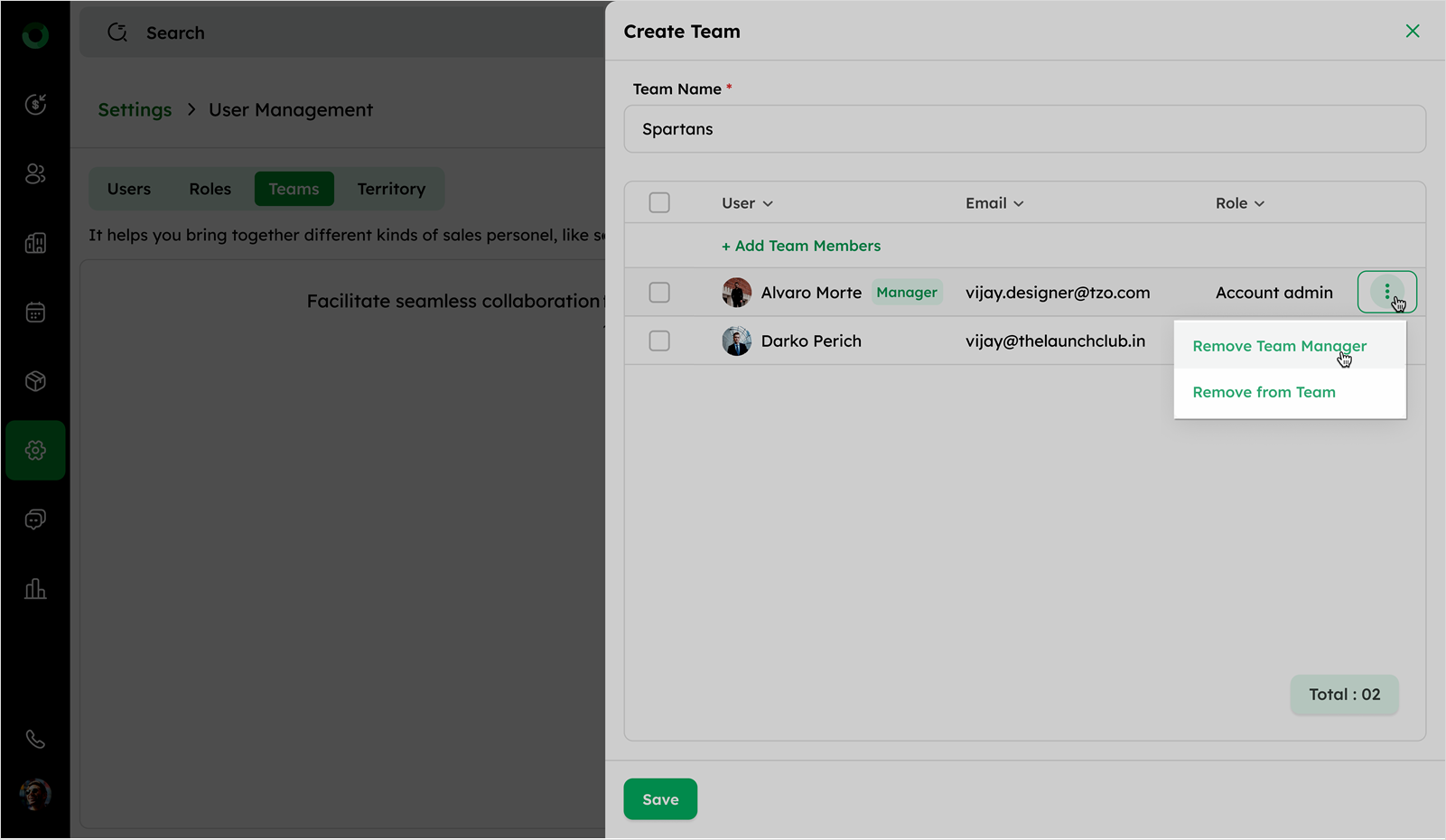 e) Click the ellipsis icon menu next to a team member to assign a managerial role or remove the user.
